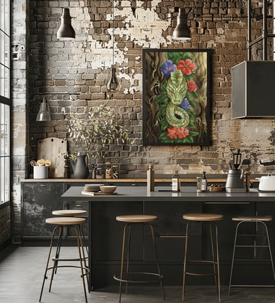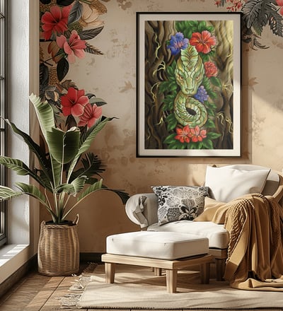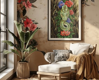 This artwork’s semi-realistic style blends lifelike details with artistic flair, making it a perfect piece for nature enthusiasts, wildlife lovers, or anyone seeking a unique, statement-making piece for their home or workspace. The snake’s symbolic presence, combined with the blooming flowers, represents themes of transformation, growth, and renewal.