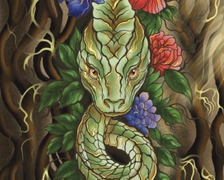 Surrounding the snake is a rich, textured backdrop of lush green foliage and earthy brown tones, evoking the dense atmosphere of a jungle. The plants and flowers surrounding the snake are intricately designed, adding layers of depth and creating a harmonious connection between the snake and its environment.