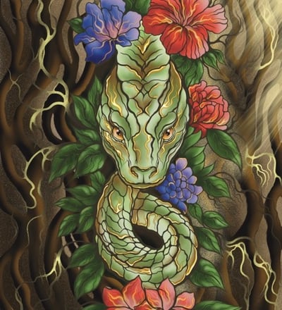 The warm and vibrant color palette — dominated by greens, reds, blues, and yellows — stands out against the textured, natural backdrop. The composition is thoughtfully balanced, guiding the viewer’s gaze from the snake’s intricate body to the surrounding floral and leafy elements.