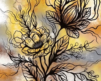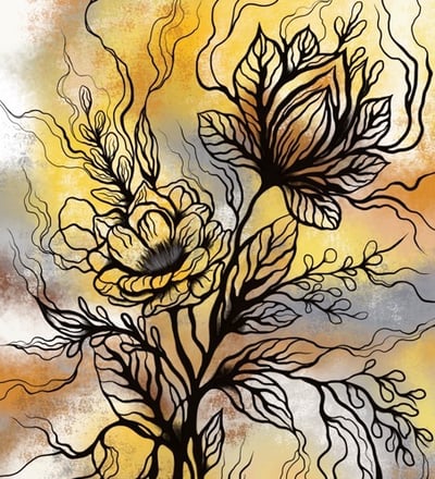 Inspired by watercolor paintings, this artwork blends soft edges with intricate petal details, adding an ethereal quality to the composition. The simplicity of the black-and-white flowers paired with the richness of the gradient backdrop offers a harmonious balance between minimalism and bold color.
