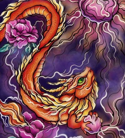 Colorful Fantasy Creature. Adorned with two pink flowers on either side, this abstract dragon artwork is a stunning representation of magical fantasy. Perfect for those who love vibrant colors and intricate designs in their art collections!