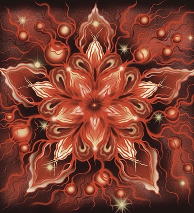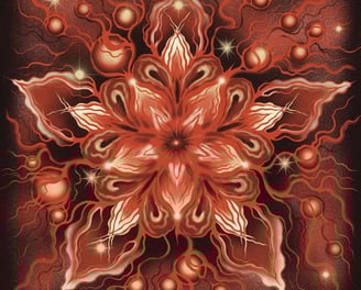 This flower serves as the focal point of the piece, emitting a warm, glowing light that extends outward, illuminating the canvas with a dreamlike aura. Surrounding the central bloom are smaller scattered stars, adding a celestial and mystical dimension to the composition.