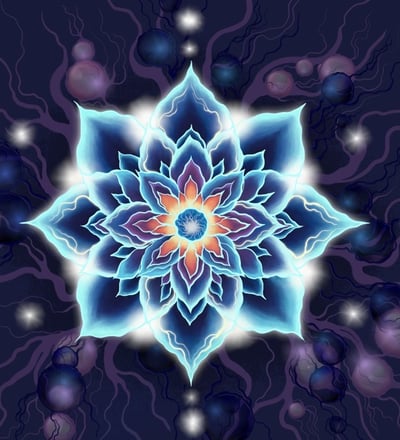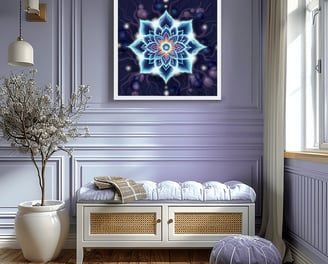 At the heart of the piece is an intricately designed colorful flower mandala, featuring layers of petals in blue, pink, and orange. Its core is adorned with an eye-like pattern, evoking the concepts of contemplation and inner vision.