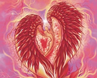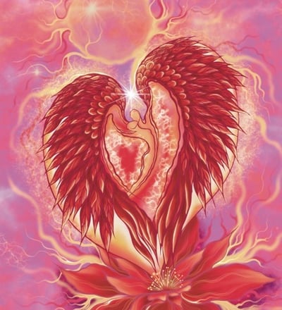 At the center of this composition is a vibrant, heart-shaped flower, its petals unfurling to reveal two ethereal figures floating together in a gentle embrace. Their glowing, winged forms radiate warmth and energy, symbolizing love, unity, and spiritual connection.
