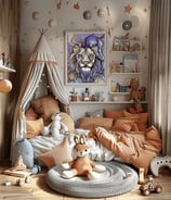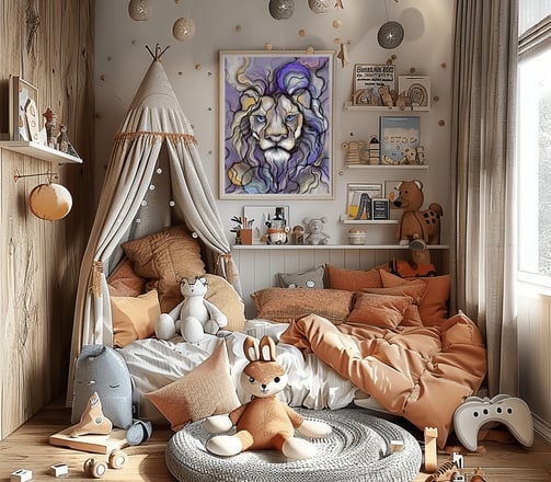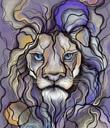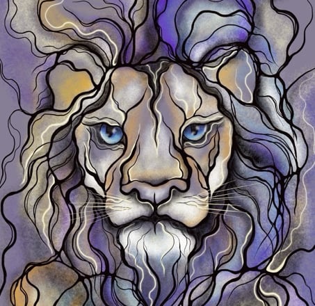 Blue-Eyed Abstract Lion with Vibrant Geometric Accents